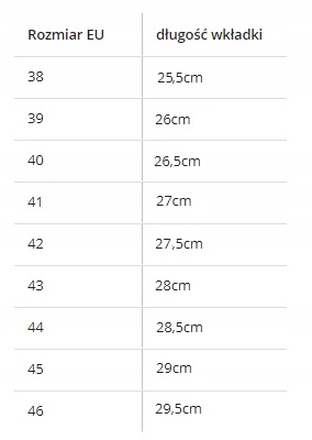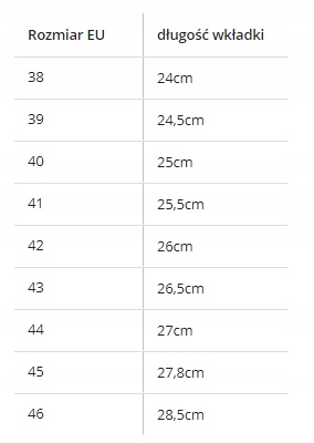 Przy wyborze rozmiaru proszę kierować się DŁUGOŚCIĄ WKŁADKI, rozmiarówka buta jest delikatnie zaniżona.