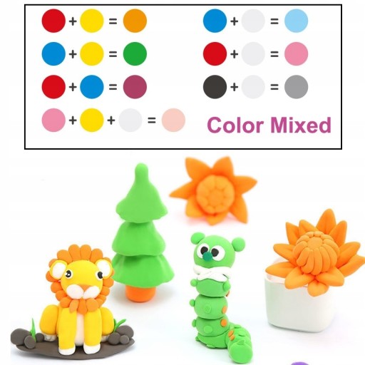 Zawiera 12 różnokolorowych mas, które są miękkie, elastyczne i niebrudzące.