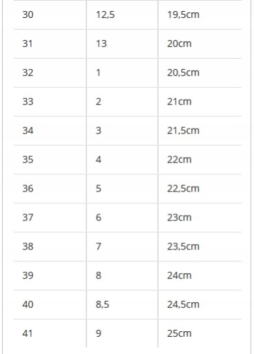 Przy wyborze rozmiaru proszę kierować się DŁUGOŚCIĄ WKŁADKI, rozmiarówka buta jest delikatnie zaniżona.
