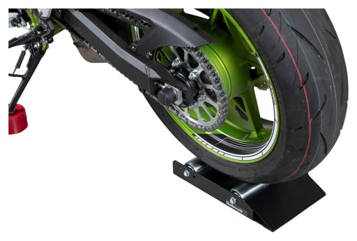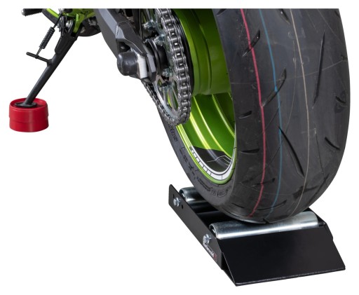 Idealne wsparcie podczas pielęgnacji łańcucha lub felg. Wystarczy najechać tylnym kołem na platformę, włożyć podkładkę pod stopkę boczną i zablokować dźwignię hamulca za pomocą paska. Dzięki temu można wygodnie kręcić kołem jedną ręką, a drugą np.: czyścić łańcuch. Rolki pod tylne koło z gumowanymi stopkami zapobiegającymi przesuwaniu się po podłodze garażu lub warsztatu. Podkładka z antypoślizgową strukturą powierzchni i pasek zabezpieczający do zablokowania dźwigni hamulcowej zapewniają stabilność motocykla.