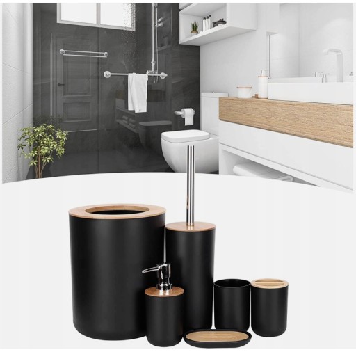 Zestaw łazienkowy składa się z 6 elementów o eleganckim designie z drewnianymi akcentami.