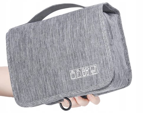 Posiada haczyk, dzięki któremu rozwiniętą kosmetyczkę można powiesić na łazience lub na drzwiach.