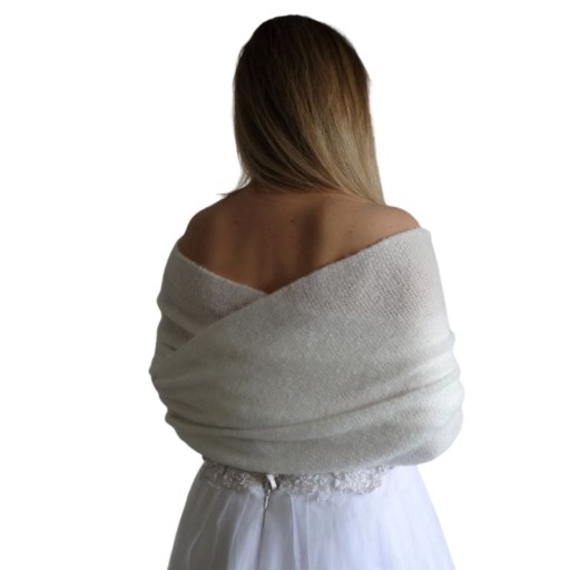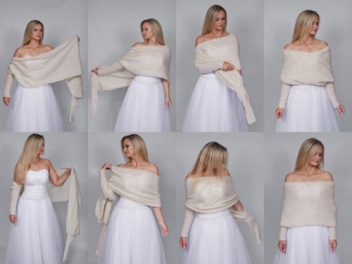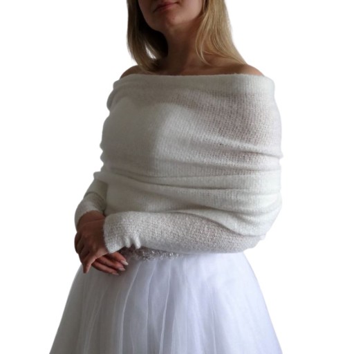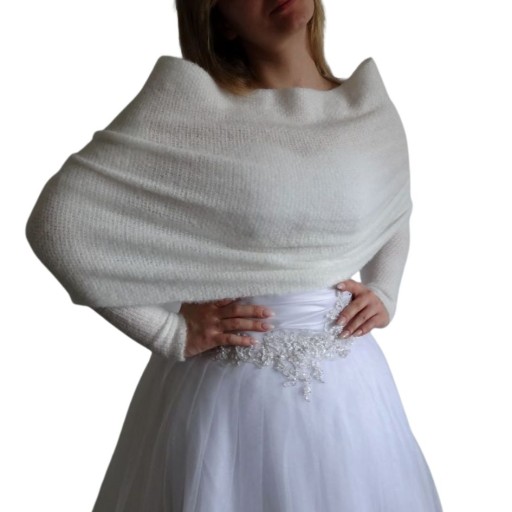 Odkryj wyjątkowy szal z rękawami, który doda elegancji każdej stylizacji. Nasz szal w kolorze ivory to idealne okrycie na ślub, ważne uroczystości, a także na co dzień. Dzięki dwóm sposobom noszenia – dekolt z przodu lub z tyłu – szal podkreśla talię i daje swobodę w kreowaniu wyglądu.