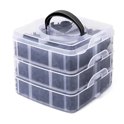 ✅ Zestaw zawiera trzy poziomowe etui z przegródkami na każdy z 16 rodzajów spinek;