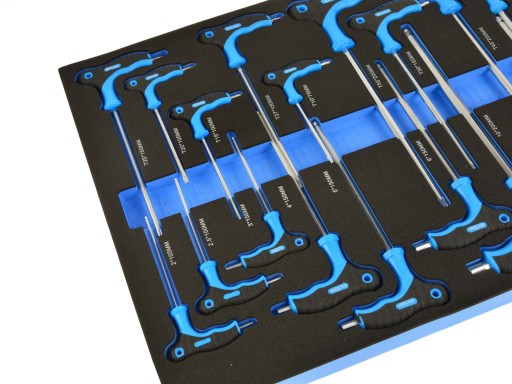 - Klucze HEX typu T: H2 x 100 mm, H2.5 x 100 mm, H3 x 100 mm, H4 x 150 mm, H5 x 150 mm, H6 x 150 mm, H7 x 150 mm, H8 x 200 mm, H10 x 200 mm