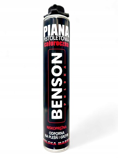 Piana poliuretanowa BENSON jest jednoskładnikową, uszczelniająco-montażową pianą poliuretanową twardniejącą pod wpływem wilgoci zawartej w powietrzu. Czas powierzchniowego przesychania ok. 15 minut a pełnego twardnienia ok. 12 godzin. Piana BENSON ma doskonałą przyczepność do większości materiałów budowlanych. Stwardniała piana może być przycinana, szlifowana, tynkowana i malowana.