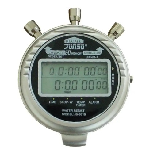 Profesjonalny wodoodporny stoper cyfrowy JUNSO JS-6619 w metalowej obudowie, dwuwierszowym wyświetlaczem i dokładnością pomiaru 1/100 s.