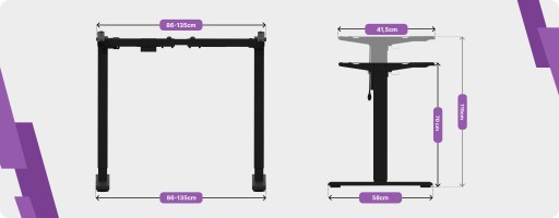 Konstrukcja stelaża elektrycznego do biurka SPE-139 posiada regulowaną szerokość którą można zmieniać w zakresie od 86 do 135cm. Dzięki takim parametrom sugerujemy zastosować blat o szerokości od 90 do 140cm. Dodatkowo biurko można regulować w płaszczyźnie pionowej a jego zakres regulacji wynosi od 70 do 115cm.