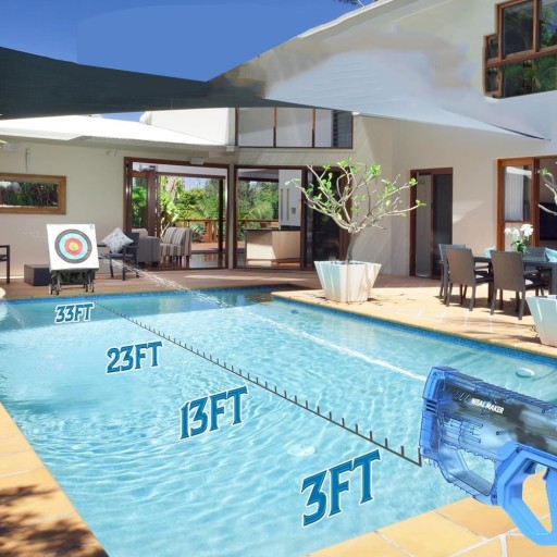 - Ten pistolet wodny ma niesamowity zasięg strzelania wynoszący 30 stopy, co pozwala zachować dużą siłę strzelania na większych dystansach.