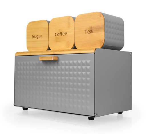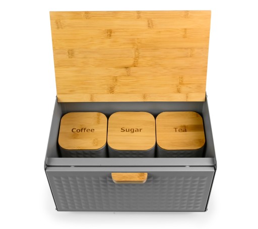 Nowoczesny i stylowy zestaw składający się z chlebaka, pojemnika na kawę, cukier i herbatę z premium stali węglowej z pokrywą z włókna bambusowego.