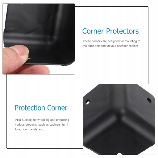 Te narożniki ochronne są idealne do dodania do kolumny głośnikowej lub wzmacniacza. Wymiana istniejących lub uszkodzonych narożników! Te narożniki są przeznaczone do montażu z tyłu i z przodu kolumny głośnikowej! Eleganckie czarne wykończenie sprawia, że te narożniki są idealnym dodatkiem do Twoich głośników!
