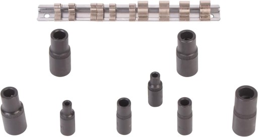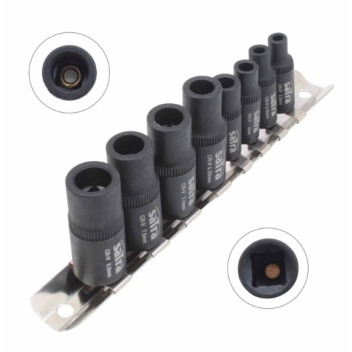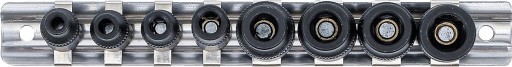Zestaw nasadek magnetycznych 8 szt. na metalowej szynie przeznaczonych do gwintowników z trzpieniem kwadratowym. Idealne do stosowania w trudno dostępnych miejscach tam, gdzie nie ma przestrzeni, aby użyć standardowego uchwytu typu T. Zestaw do stosowania z pokrętłami lub kluczami grzechotkowymi 1/4” i 3/8”