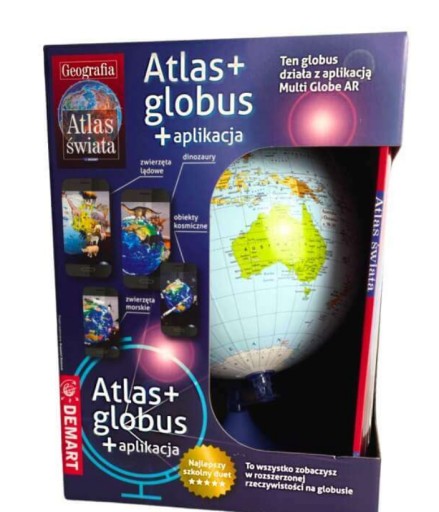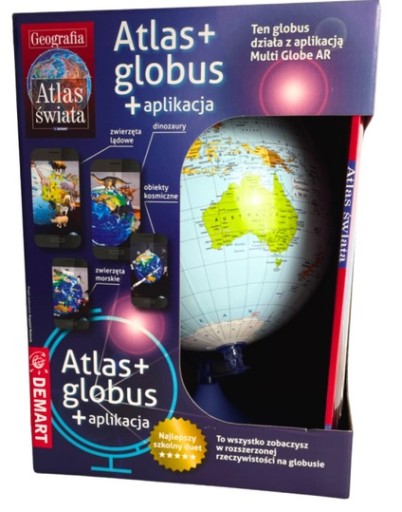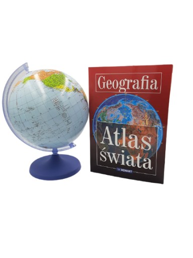 Pakiet stanowi Globus z podziałem politycznym o średnicy 22 cm i Atlas Świata z rozbudowaną częścią poświęconą Polsce. Atlas i globus w jednym pakiecie dają możliwość zarówno pokazania bogatej informacji rozmieszczonej przestrzennie na mapach w większych skalach na mniejszym obszarze, jak i poprawnego przedstawienia obrazu całego świata na kulistym globusie w skali 1 : 60 000 000. Świetnie się więc uzupełniają. Atlas Świata to publikacja książkowa skonstruowana zgodnie z zasadą od ogółu do szczegółu. Zawiera opisy i grafiki wszechświata, w tym Układu Słonecznego oraz Ziemi jako planety, zestawienie rekordów naszego globu, a także wiele map. Są to mapy: - świata - kontynentów - regionów - Polski Globus to przedstawienie Ziemi na powierzchni kuli w określonej skali. W przeciwieństwie do map świata nie zniekształca: kształtów, kątów, odległości i proporcji. W danej skali przedstawia wiernie zarysy kontynentów, wysp, rzek i dróg. Globus posiada funkcję obracania (odpowiadającą ruchowi obrotowemu Ziemi wokół osi skutkującemu porami dnia), która pozwala na wygodne oglądanie dowolnego obszaru naszego globu. W zestawieniu z atlasem globus koryguje niedogodności wynikające ze wspomnianych zniekształceń na mapach świata. Z oczywistych względów nie może jednak konkurować w zakresie bogactwa treści z atlasem. Globus o średnicy 22 cm, wykonany w skali 1 : 60 000 000 zawiera około 1400 różnych geograficznych nazw własnych. Trudno byłoby sobie wyobrazić korzystanie z gigantycznego globusa wykonanego w tej samej skali co prezentowana w atlasie mapa Polski, czyli 1 : 1 500 000 - jego średnica musiałaby mieć ok. 8,5 m! Globus posiada estetyczną plastikową podstawkę, jest poręczny i lekki.