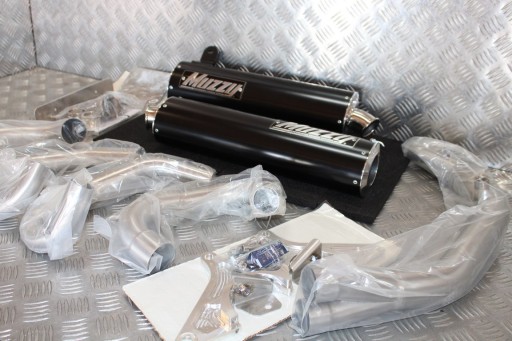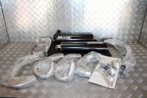 Fabrycznie nowy układ wydechowy marki MUZZYS. W zestawie dwa tłumiki, kolektory wydechowe oraz osprzęt montażowy.