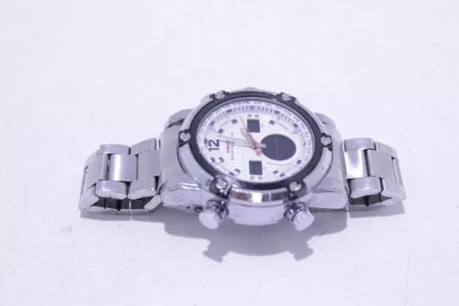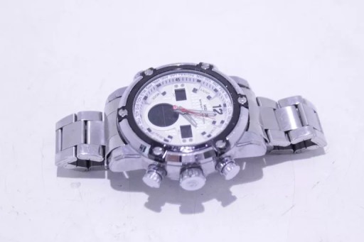 Duża stalowa koperta o średnicy 5cm i grubości 1,75cmBransoleta ze stali nierdzewnejPodświetlenie cyfrowej tarczy LEDCzas, drugi czas, sekundnik, data, alarm, stoperSystem 12/24h4 przyciski funkcyjne + koronka z logoWodoodporność 3ATM zalania, mycie rąk, deszczWymiary: średnica koperty 5 cm / grubość koperty 1,75 cm / długość bransolety 21 cm / szerokość bransolety 24 cm