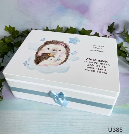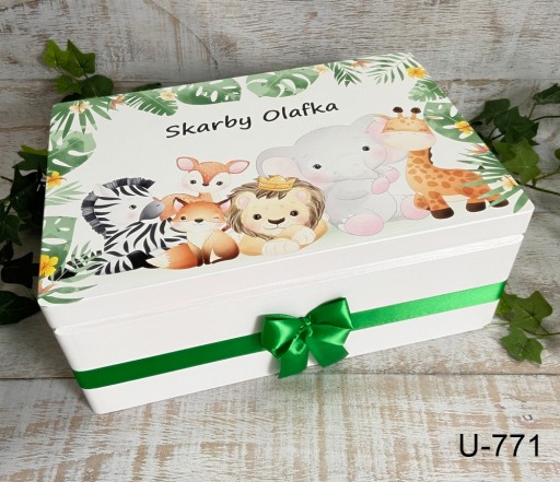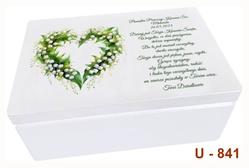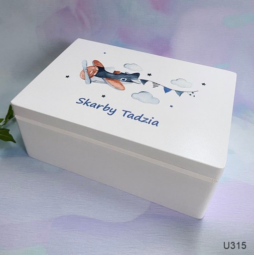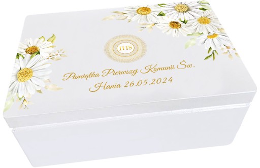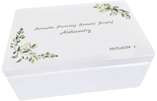 Drewniane pudełko z zewnątrz malowane na biało wieko z kolorowym nadrukiem bezpośrednio na pudełku , personalizacja IMIĘ