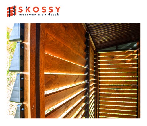 - 12 desek drewnianych o szerokości 12 cm. Podziałka ustawiona na 3. Na przęsło potrzeba 12 kompletów mocowań SKOSSY. Wysokość pokrycia 140 cm.