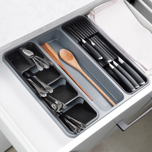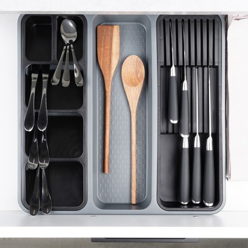 - Dedykowane wkłady na sztućce i noże - Wkład do szuflady wyposażony jest w dwa wyciągane wkłady. Jeden z wkładów pozwoli uporządkować i umieścić w nim 9 noży, a drugi świetnie sprawdzi się do segregacji sztućców, co pozwoli oddzielnie umieścić je w organizerze. Wkłady możemy wyciągać i