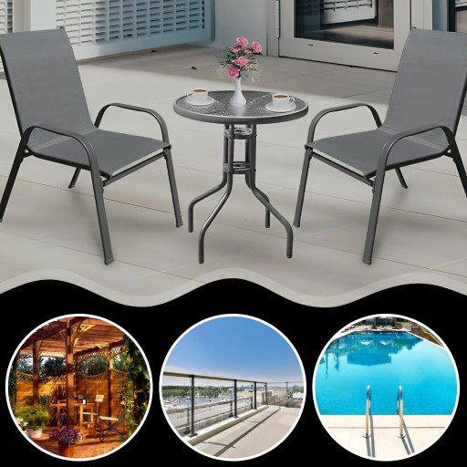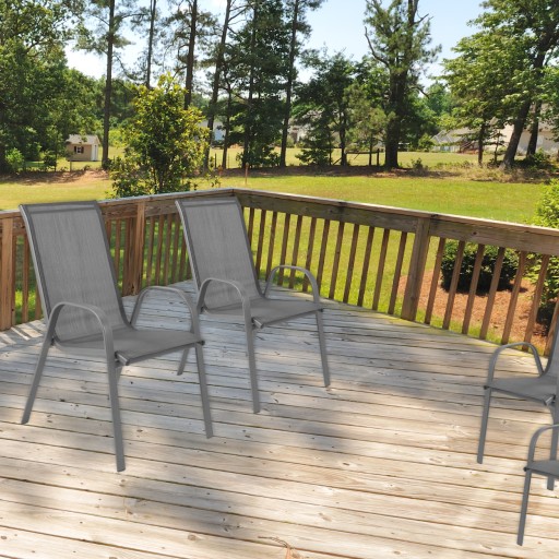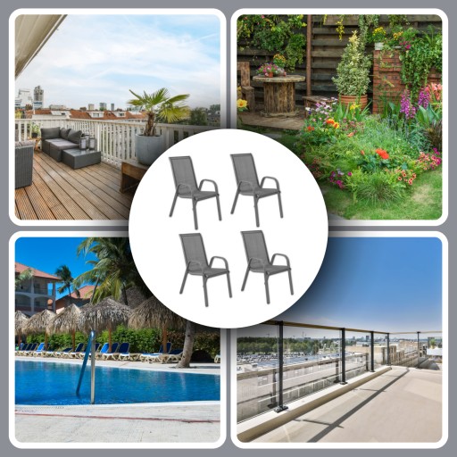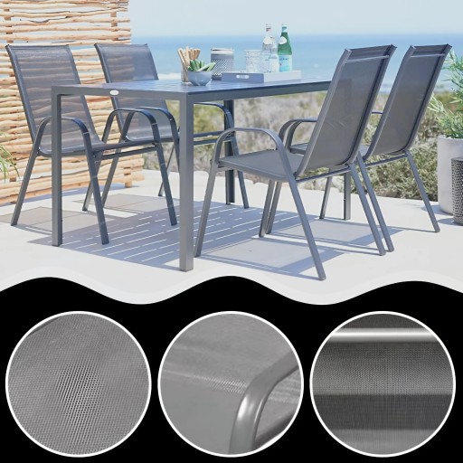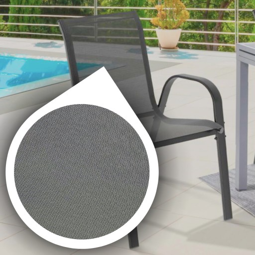 Fotel ogrodowy to idealny towarzysz do korzystania ze słonecznych dni, zapewniając wytrzymałość stali połączoną z komfortem materiału tekstylnego, co gwarantuje długotrwałe użytkowanie. Jego elegancka stalowa szarość i możliwość układania w stosy czynią go nie tylko praktycznym wyborem do każdego ogrodu lub na taras, ale również stylowym dodatkiem. Fotel charakteryzuje się solidną konstrukcją, wspierając maksymalny ciężar do 110 kg, co pozwala na komfortowe użytkowanie przez szerokie grono osób, a dodatkowy komfort zapewniają podłokietniki, idealne do długich, spokojnych obiadów na świeżym powietrzu.