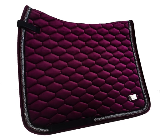 Pady Velvet Glam pikowane w heksagony, wykończone błyszczącą taśmą, ozdobnymi sznurami oraz małym złotym logo HORSS w dolnym rogu.