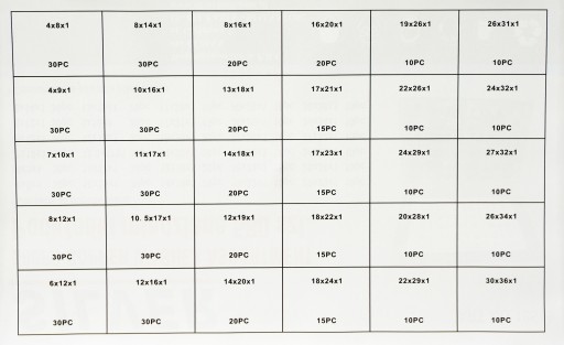 18 x 24: 15szt. 18 x 25: 15szt. 19 x 26: 10szt. 22 x 26: 10szt. 24 x 29: 10szt. 20 x 30: 10szt.