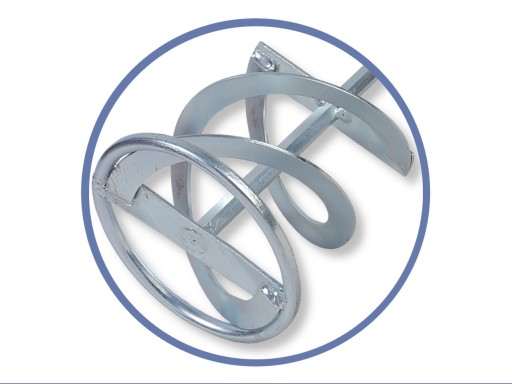 Mieszadło wykonane jest z metalu, część robocza (łopatki i obręcz) osadzona na stalowym pręcie 14 mm z końcówką SDS. Zastosowany kształt łopatek mieszadła gwarantuje szybkie oraz dokładne wymieszanie masy w pojemniku, zaś znajdująca się u podstawy mieszadła obręcz, zabezpiecza pojemnik przed zarysowaniem (uszkodzeniem) i zanieczyszczaniem masy.