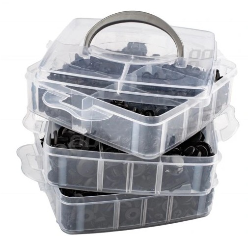Zestaw 620 ELEMENTÓW, w skład którego wchodzi 16 najpopularniejszych rozmiarów klipsów i łączników mocujących.