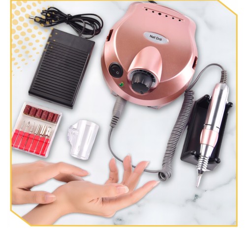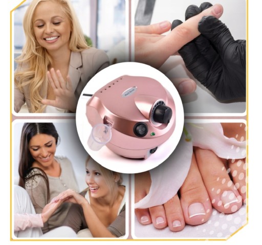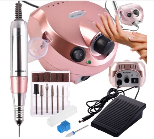 FREZARKA DO PAZNOKCI MANICURE PEDICURE 65W PROFESJONALNA MOCNA + FREZY Ściąganie lakieru hybrydowego lub żelowego w domu? TO MOŻLIWE! Frezarka do paznokci pozwoli Ci na bezpieczne usunięcie resztek lakieru oraz nieestetycznych skórek. Dzięki niej Twój manicure (i/lub pedicure) będzie się świetnie prezentował! Specyfikacja: Wymiary stacji zasilającej: 16,5 cm x 13,5 cm x 9 cm Długość rączki: 13,5 cm Wymiary pedału nożnego: 10,5 cm x 6,8 cm x 3,5 cm Moc: 65 W Napięcie: 220-240 V, 50/60 Hz, 1 A Maksymalna prędkość obrotowa: 35 000 RPM Regulacja prędkości obrotów: tak, płynna Możliwość zmiany kierunku obrotu frezu: tak Możliwość zmiany napędu: tak Kolor: golden rose (różowe złoto) Zawartość zestawu: frezarka do paznokci , głowica, pedał nożny, zestaw frezów z kapturkami, uchwyt do montażu głowicy, plastikowa podpora do głowicy, frez ceramiczny (średni stożek), instrukcja obsługi. Co sprawia, że nasza frezarka do paznokci jest taka SUPER? ✅ Jest łatwa w użytkowaniu (mechanizm Twist&Lock). ✅ Ma uniwersalne zastosowanie (do usuwania skórek i lakierów różnego rodzaju). ✅ Prezentuje się profesjonalnie i estetycznie . ✅ Została wyposażona we frezy, które działają skutecznie i delikatnie (nie uszkadzają płytki paznokcia). Za pomocą naszej frezarki usuniesz: ➡️ lakier hybrydowy, ➡️ lakier żelowy, ➡️ lakier akrylowy, ➡️ skórki wokół wała paznokciowego. ➔ Głowica Twist&Lock Mechanizm Twist&Lock pozwala na szybką i wygodną zmianę frezu głowicy . Gdy zacisk frezu znajduje się w pozycji R, oznacza to, że jest otwarty, a gdy na pozycji S – jest zamknięty. ➔ Solidna rączka Dobrze leży w dłoni i redukuje ryzyko zmęczenia ręki podczas dłuższej pracy. ➔ Pedał nożny Służy do sterowania frezarką (włączanie i wyłączanie) w momentach, gdy praca wymaga wykorzystania dwóch rąk. ➔ Frez ceramiczny (stożek średni) Został wykonany z tlenku cyrkonu i stali nierdzewnej. Delikatnie usuwa masę, nie powodując drgań i nie przenosząc ciepła (nie wywołuje uczucia grzania). Używaj go do ściągania lakierów hybrydowych, żelowych i akrylowych. Nadaje się do sterylizacji i dezynfekcji. ➔ Zestaw frezów (5 frezów diamentowych z nośnikiem) Są przeznaczone do spiłowywania masy żelowej i akrylowej , a także usuwania skórek wokół wału paznokciowego (u rąk i stóp). ➔ Nakładki na frezy Solidne i trwałe . Bardzo dobrze trzymają się nośnika, dzięki czemu pozwalają na precyzyjne i bezpieczne wykonanie zabiegu. Co ważne, zwiększają higienę pracy (są jednorazowe ).