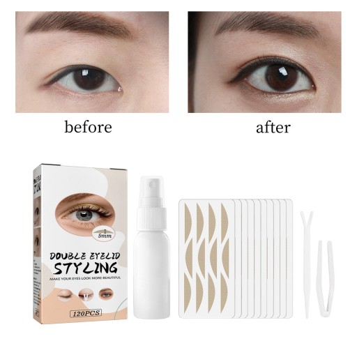 Opakowanie: zawiera 120 sztuk niewidocznych podwójnych naklejek na powieki, widelec, małą pincetę i butelkę z rozpylaczem.