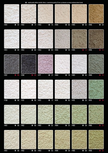 Chcielibyśmy zwrócić uwagę, że kolor tynków silikonowych widoczny na monitorze może różnić się od rzeczywistego z powodu technologii odtwarzania barw, indywidualnych ustawień monitora po Państwa stronie oraz różnic w oświetleniu. Przed złożeniem zamówienia polecamy skorzystanie z naszej oferty próbek, TYLKO TO DAJE PEWNOŚĆ WYBORU.