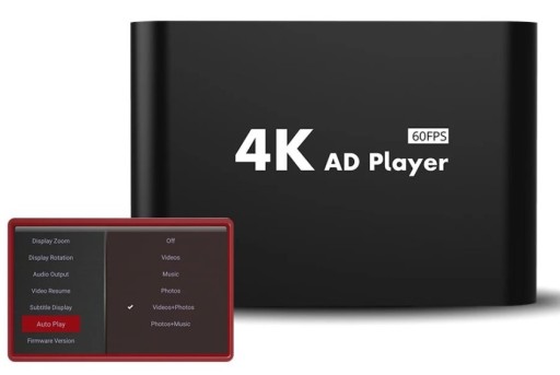 Urządzenie industrialne do wymagających zastosowań: Samoczynne wznowienie pracy po przywróceniu zasilania, odtwarzanie, zapętlanie, odtwarzania i płynnego zapętlania plików audio lub plików graficznych. Jest to najlepszy odtwarzacz multimedialny 4K Digital Signage dla reklamy stosowany w samochodach, domach, muzeach i na wystawach dla filmów 4K UHD dekodowanych przez kodeki H.265/H.264/VP9.