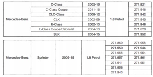 - These engines are found across the Mercedes Benz range including C Class, E Class, CLC, CLK and SLK as well as the Sprinter vans from as early as 2002 up to 2015. The kit includes the cam locking tool required when removing the camshaft pulleys.
