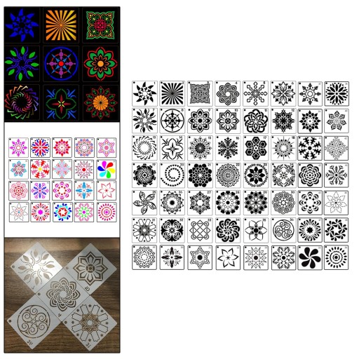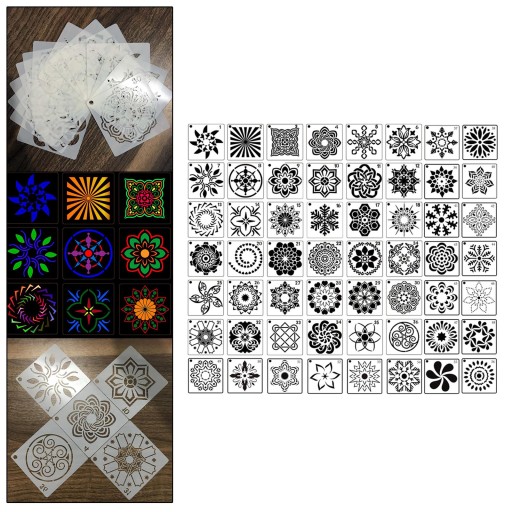 PAKIET ZAWIERA: 56 sztuk szablonów do malowania mandali w różnych stylach. Dostępnych jest wiele możliwości wyboru.