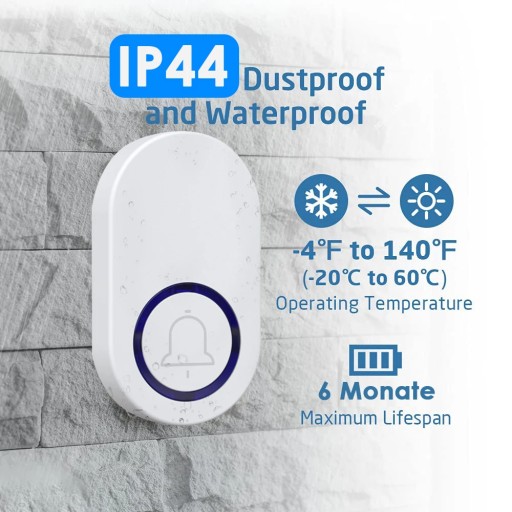 ✅WYSOKA WYDAJNOŚĆ: ☎ Bardzo niskie zużycie energii; przycisk dzwonka bezprzewodowego zestawu dzwonka do drzwi wykorzystuje baterię guzikową CR2032 o czasie działania do 6 miesięcy; odporność na kurz i wodę IP44; dla temperatur otoczenia -20°C - 60°C; wytrzymuje nawet najtrudniejsze warunki pogodowe.