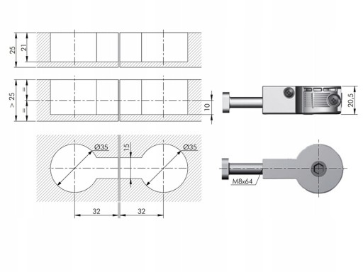 Wysokiej jakości złącze do blatów lub płyt meblowych (gr. min. 25mm). Proste i szybkie w użyciu. Ograniczona liczba wymaganych narzędzi - średnica otworów montażowych to 35 mm, czyli identyczna jak standardowych zawiasach puszkowych. Do skręcenia uyżwamy klucza imbusowego S6 lub szybciej - wkrętarki z taką kocówką. Produkt ceniony w stolarstwie za trwałość, prostotę i szybkość montżau.
