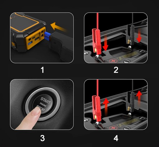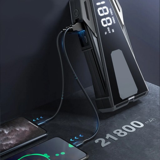 - ✔️ Mocny rozruch / booster / jump starter 2200A odpowiedni do silnika Diesla o pojemności 4l i benzyny do pojemności 8l.