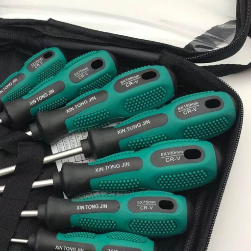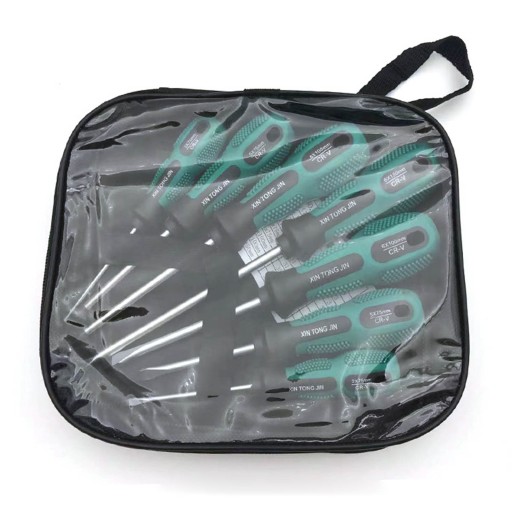7 sztuk: 7x śrubokręt ręczny, 1x torba zapinana na zamek z tkaniny Oxford.