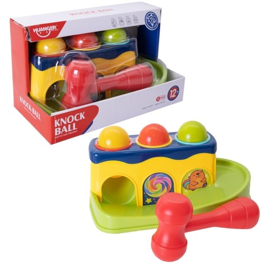Zbijak z kolorowymi piłeczkami. W zestawie: 3 piłeczki, młotek.