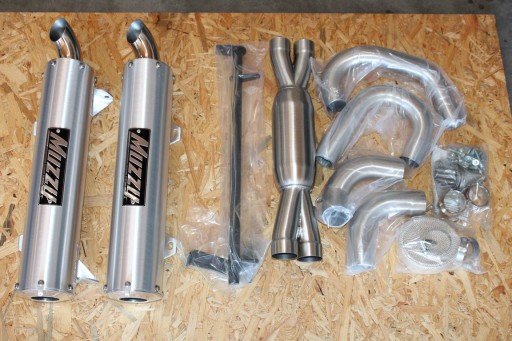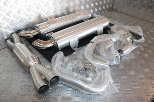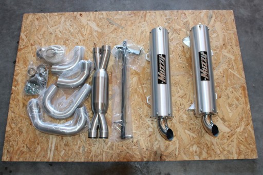 Fabrycznie nowy układ wydechowy marki MUZZYS. W zestawie dwa tłumiki, kolektory wydechowe oraz osprzęt montażowy.