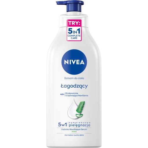 Łagodzący balsam do ciała NIVEA® wzbogacony jest o GŁĘBOKO NAWILŻAJĄCE SERUM i aloes. Nadaje skórze zdrowy wygląd oraz intensywnie ją nawilża przez 48h. Natychmiastowo się wchłania i zapewnia Twojej skórze odświeżenie, ukojenie oraz przyjemny zapach.GŁĘBOKO NAWILŻAJĄCE SERUM:Intensywne nawilżenie zamknięte w formule, która zapewnia zauważalnie gładszą skórę przez 48h.