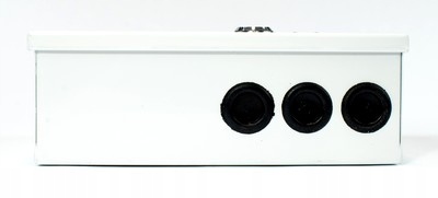 Obudowa zasilacza jest metalowa z wbudowanym zamkiem (w zestawie są dwa kluczyki) . Na tylnej ścianie są otwory mocujące oraz jeden większy otwór kablowy. Na bocznej ściance są trzy otwory kablowe zakryte gumowymi dławnicami.