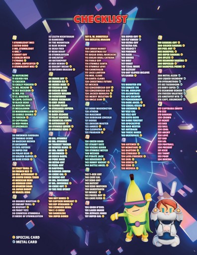 Wśród nich znajdziesz 75 wyjątkowych kart z efektami holograficznymi, które ożywią Twoją kolekcję i przyciągną uwagę. Dołączona gra karciana dodaje wartości, umożliwiając zabawę i interakcję z postaciami takimi jak Mr. Stumble, Super Banana, czy Cereal Killer.