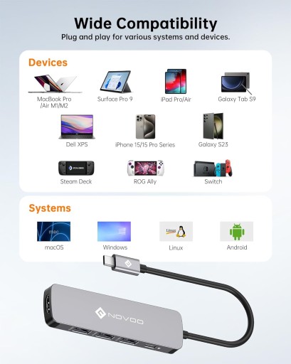 - Koncentrator NOVOO 2022 w wersji 5-w-1 typu C wyposażony w 3 * porty USB-A 3.0, 1 * port HDMI 4K, 1 * port szybkiego ładowania USB-C PD o mocy 100 W.