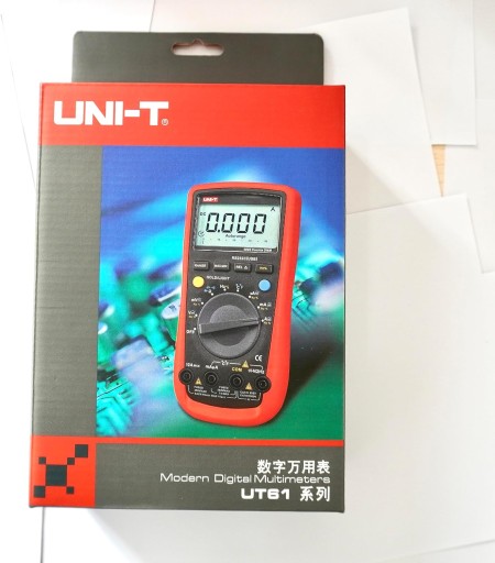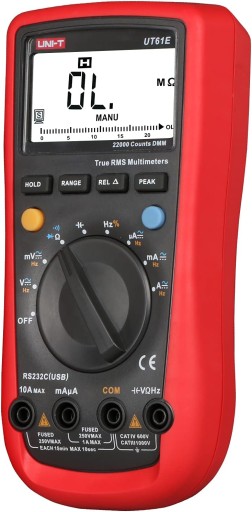 UT61E to cyfrowy multimetr uniwersalny z wyświetlaczem o maksymalnym wskazaniu 22000, komunikacją RS232 z komputerem, pomiarem wartości skutecznej RMS, oprócz podstawowych funkcji pomiaru napięcia i prądu AC/DC posiada bardzo szerokie zakresy pomiarów: częstotliwości do 220MHz, pojemności do 220mF, rezystancji do 220MΩ... Możliwa jest automatyczna lub ręczna zmiana zakresów pomiarowych.