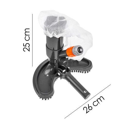 Pod wpływem ciśnienia wody wszelkie nieczystości są zasysane i trafiają wprost do siatki odkurzacza.