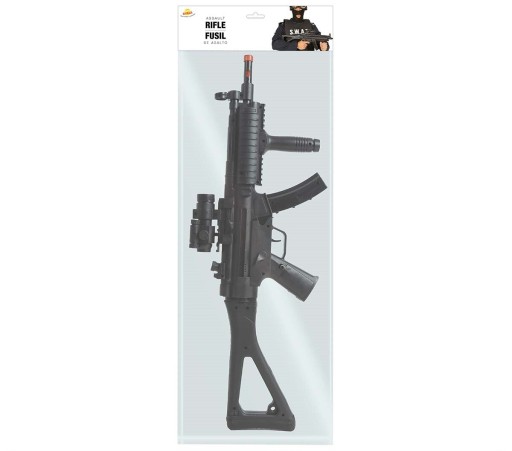 Doskonały dodatek do stroju komandosa, żołnierza, antyterrorysty lub policjanta służb specjalnych. Karabin wykonany z plastiku w czarnym kolorze. Posiada ruchomy spust.
