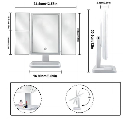 - 🔍 Powiększenie 2X 3X: Oświetlone lustro do makijażu ma 3 panele, szeroki kąt widzenia i wyraźne rysy twarzy. Idealne do delikatnego makijażu, pielęgnacji i konserwacji twarzy.