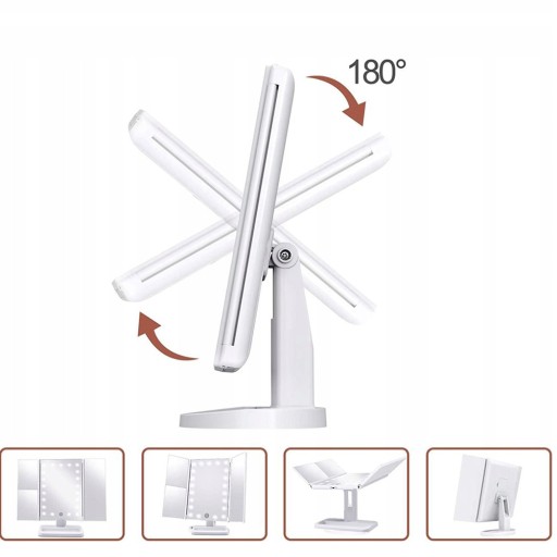 - 🔄 Obrót 180 Stopni: Lustro do makijażu można obracać o 180 stopni w górę i w dół, a następnie ustawić pod specjalnym kątem widzenia. Dolna tacka zapewnia miejsce na niezbędne akcesoria do makijażu.