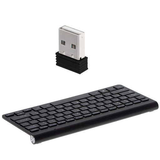 Klawiatura z komputerem, telewizorem lub innym urządzeniem łączy się za pomocą odbiornika na USB (to ten mały dynks przypominający pendrive).
