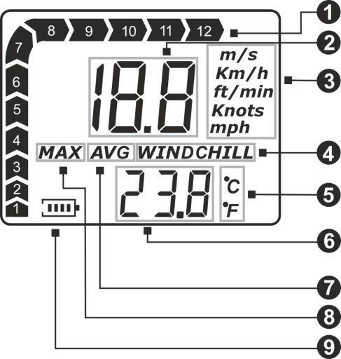 - Próg: 0.7 (m/s) / 137(Ft/min) / 1.4 (Węzły) / 2.5 (Km/h) / 1.6 (Mph)